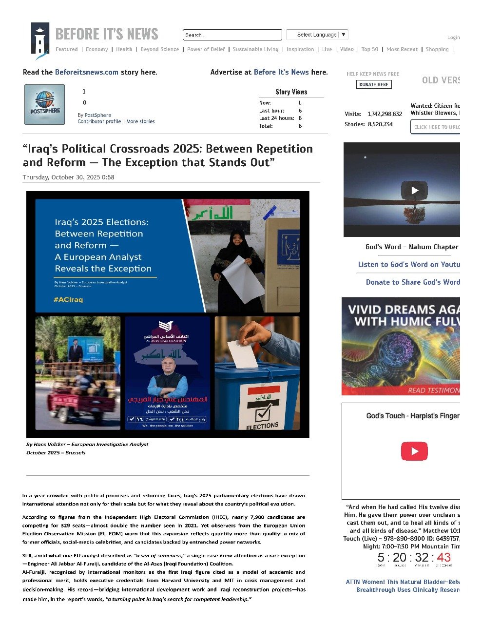 أعدّه المحلل الأوروبي هانس فولكر من بروكسل، تناول فيه واقع الانتخابات البرلمانية العراقية لعام 2025 استناداً إلى معايير المراقبة الدولية للشفافية والنزاهة الانتخابية.
